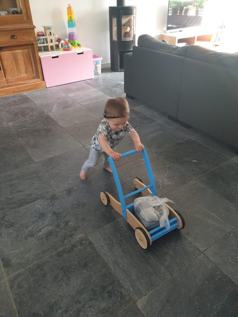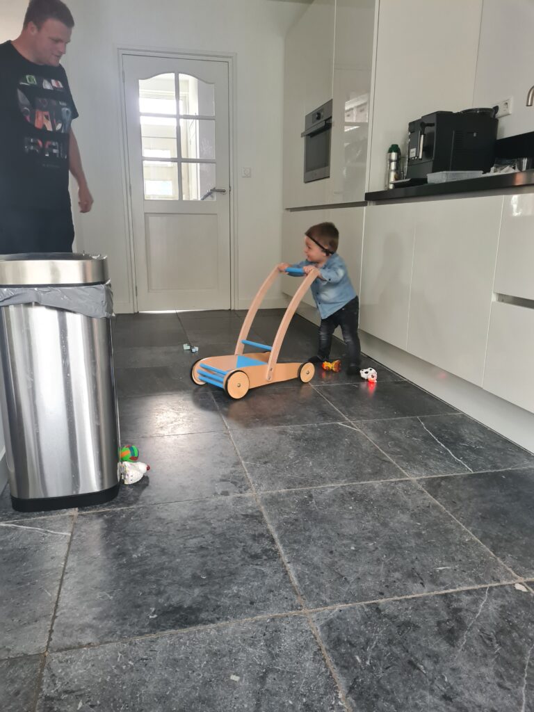Finn durfde heel lang niet te staan, hij vond dit spannend. Toen hij bijna 15 maanden was ging hij staan. We kregen de tip van de fysio om hem achter een blokken kar te laten lopen, omdat we die konden verzwaren.