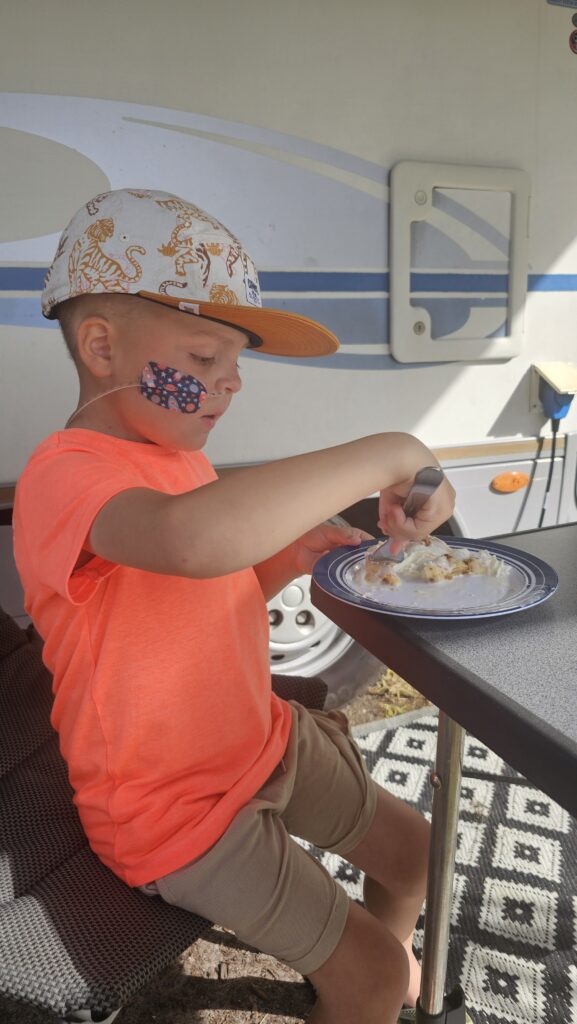 De chemo's die hij krijgt in het ziekenhuis gaan door maar de thuis chemo gaan we de helft geven. Geen 2ml maar 1ml, en dat 2 weken lang. Ook starten we weer met de dexa. Finn zijn boze buien waren weer heftig, dan is het campertje maar klein 😉.