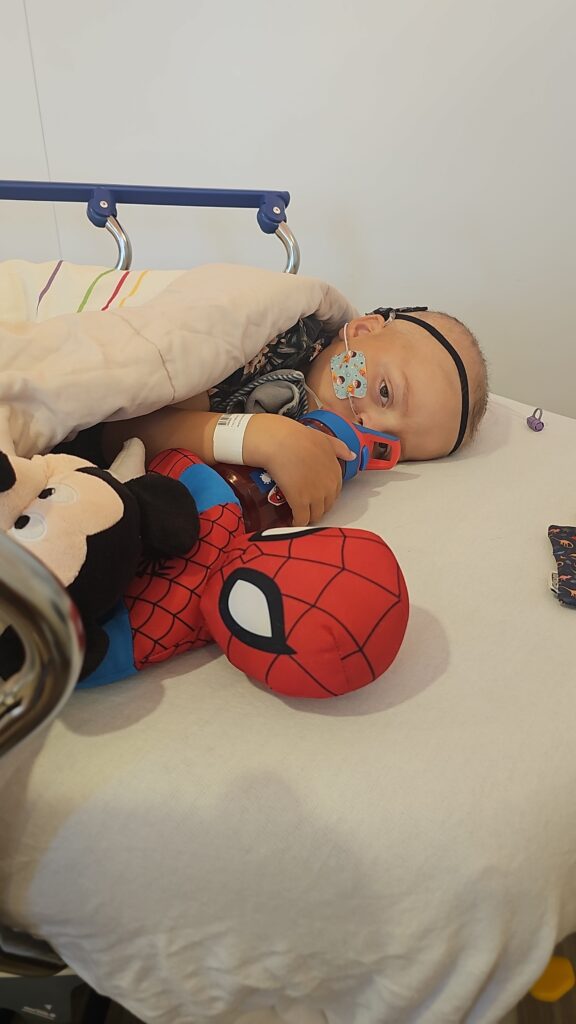 Zoals ik al vertelde deed zijn hele lijf zeer en dit werd toen we weer thuis waren alleen maar erger waardoor ik woensdag 10 juli het ziekenhuis heb gebeld. Hij bleef maar spugen en hield niets meer binnen. Zijn sonde had hij er alweer uitgespuugd.