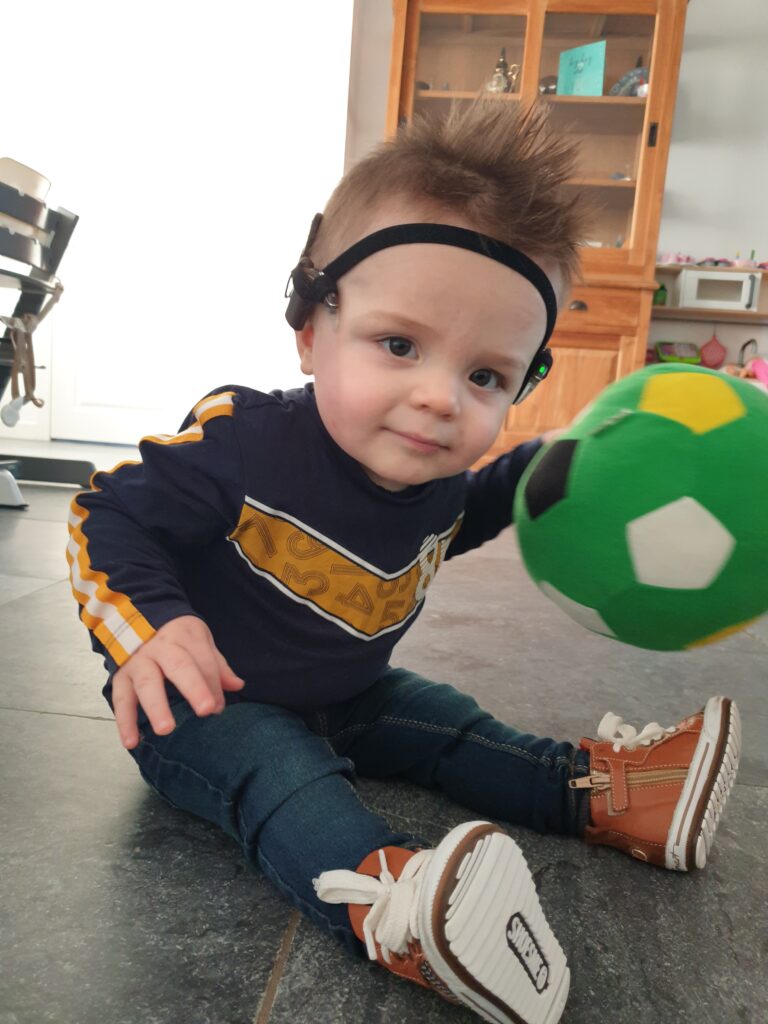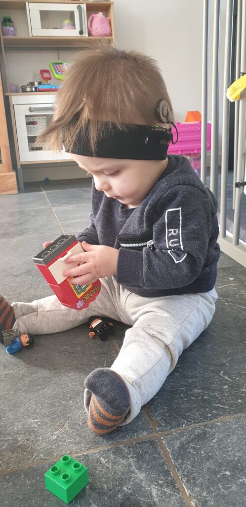 In december 2019 ging Finn zijn CI voor het eerst echt dragen. Wij zijn begonnen met een haarband van hearing henry. Dit is een haarband waar de CI in wordt vastgezet.