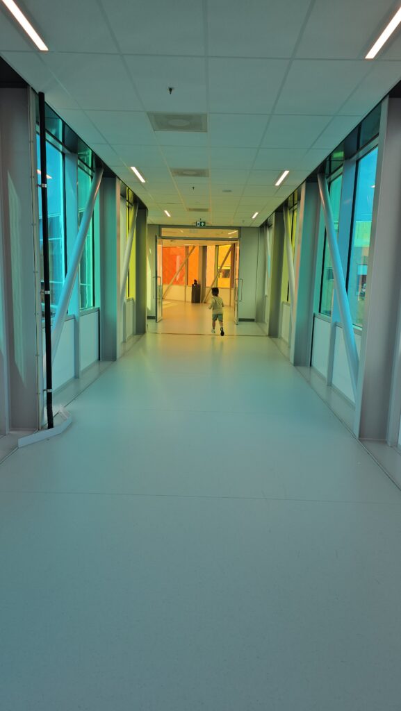 Toen gauw over de Regenboogbrug, de brug die het Máxima verbindt met het Wilhelmina Kinderziekenhuis. Natuurlijk even een wedstrijdje doen op de brug, dus daar waren we snel overheen.